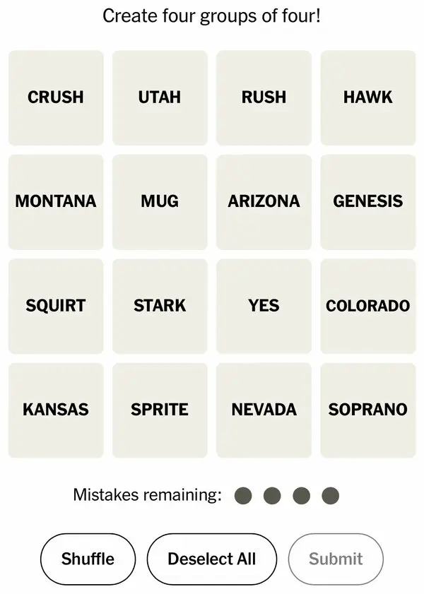 In this game, players are given 16 random words and must group them into four sets of four, where each group shares a hidden logical connection — such as category, meaning, or theme.